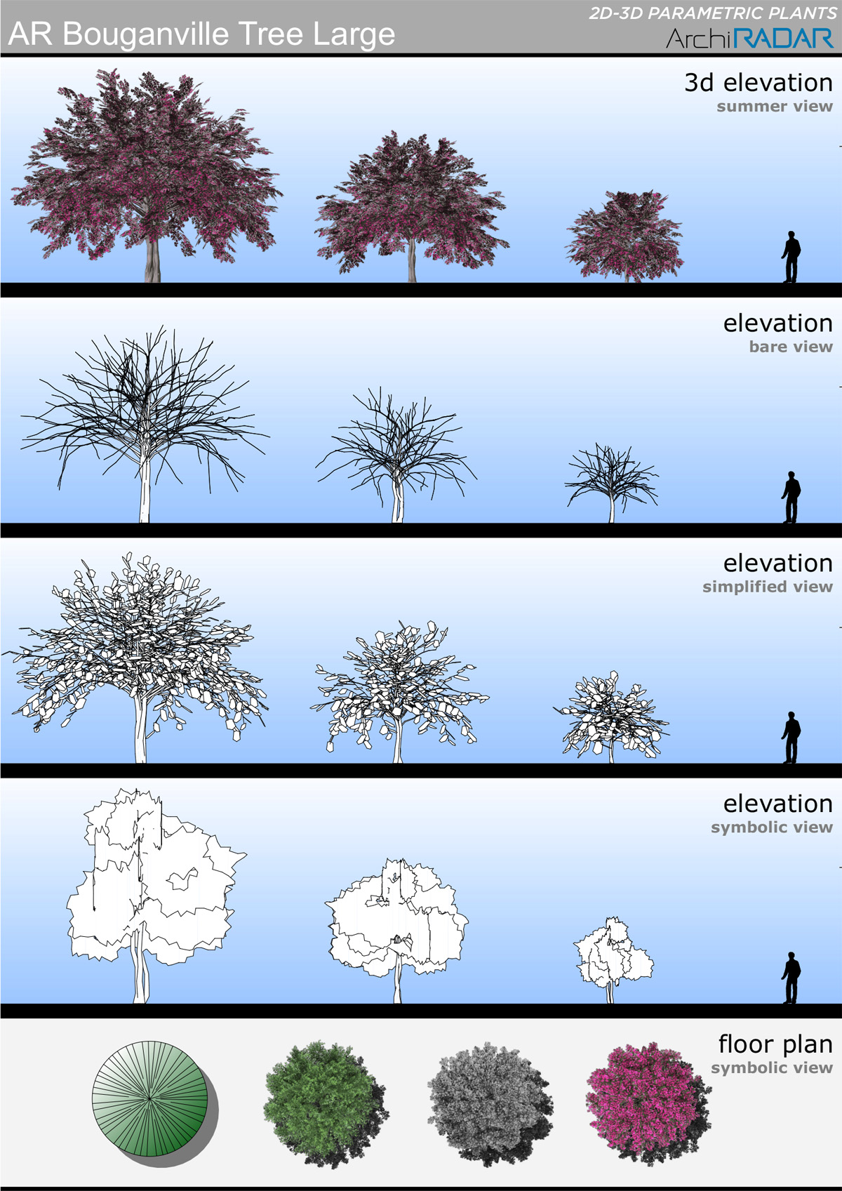 The objects are made with a low polygon quantity, they have a real growing factor according to the size and a corresponding symbolic view in elevation. Optimized for BIMX.