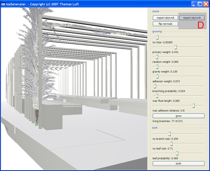 Trovata la forma e la quantità di foglie desiderate, non rimane altro da fare che esportare il rampicante ottenuto cliccando sul pulsante Esport obj+mlt (lettera D nell'immagine sottostante).