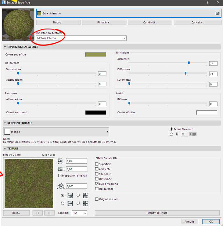 • Selezioniamo il materiale, esistente nel catalogo, "Erba - Marrone" (Oppure duplichiamolo)