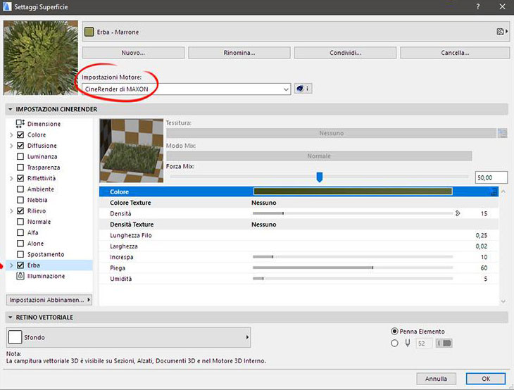 • La voce "Erba" nelle Impostazioni Cinerender è disabilitata. Facciamo un click nel box per abilitarla