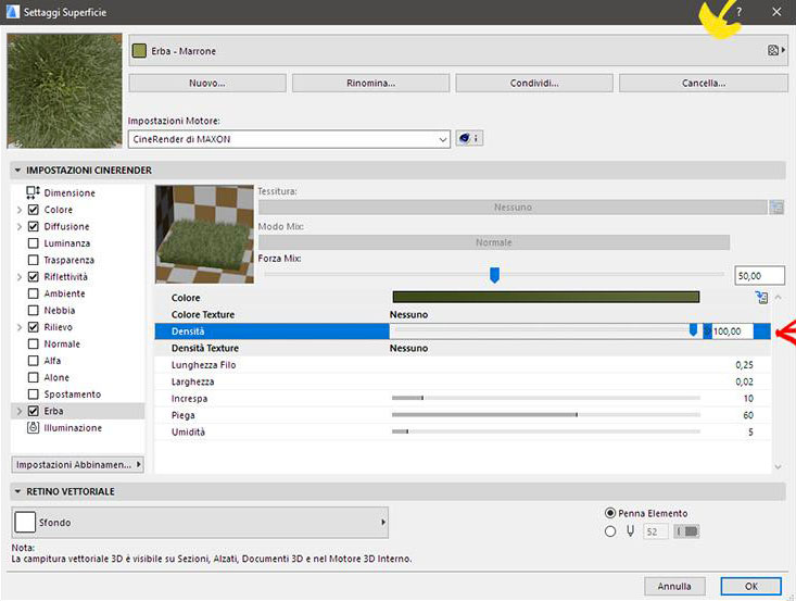 • Se desiderate aumentare la quantità di erba sulla superficie occorre tornare nei settaggi del Materiale Erba 3D di CineRender, aumentando il parametro "Densità"