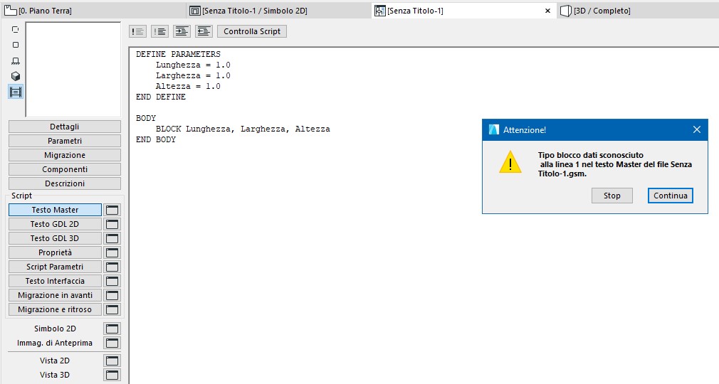 In effetti non ho mai saputo dell’esistenza di un comando chiamato DEFINE PARAMETERS, anche se devo precisare che uso una versione obsoleta di ArchiCAD (la 22) e ormai anche io sono piuttosto arrugginito. Vabbè, metto un punto esclamativo davanti al comando (che in GDL vuol dire “Ignora il testo che segue, su questa riga”) e riprovo. Altri 3 errori (e altrettanti punti esclamativi) dopo, lo script di esempio finalmente funziona in tutto il suo splendore.