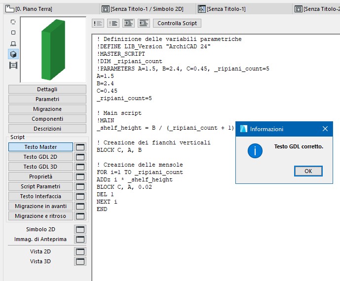 Naturalmente, questo è solo un esempio molto semplice. Per oggetti più complessi, il codice GDL può diventare più elaborato. Potremmo aggiungere ulteriori parametri per controllare altri aspetti dell'oggetto, come il materiale, il colore, la rotazione, ecc.