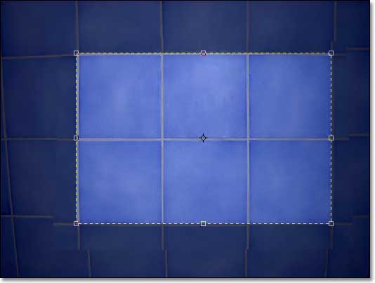 Per ridurre la percezione della ripetizione, non voglio fare una texture composta da una sola piastrella, ma prenderò le sei centrali. Dovrò fare in modo che l'area che occupano, attualmente deformata dalla prospettiva, ritorni ad essere un rettangolo. (Le fotografie risentono anche di un'altra importante deformazione, per cui le linee rette, soprattutto quelle che passano lontano dal centro dell'immagine, hanno un andamento leggermente curvo, e la curva è più accentuata se la focale