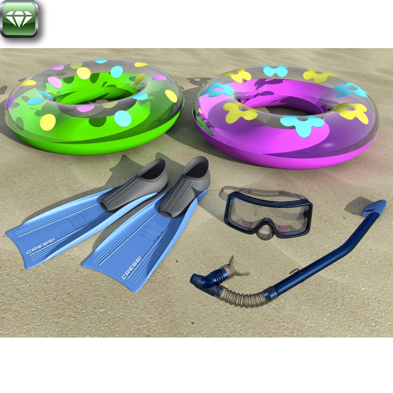 Collezione di 4 elementi 3D per il mare e la piscina con alta qualità di dettaglio.Composizione:- 2 pinne- 1 maschera con boccaglio- 2 ciambelle