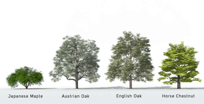 Sono alberi 3D con alta qualità di dettaglio ma al tempo stesso molto leggeri. Per farvi un esempio: 100 modelli inseriti in una scena vengono renderizzati in 7/10 minuti (a seconda del computer utilizzato).