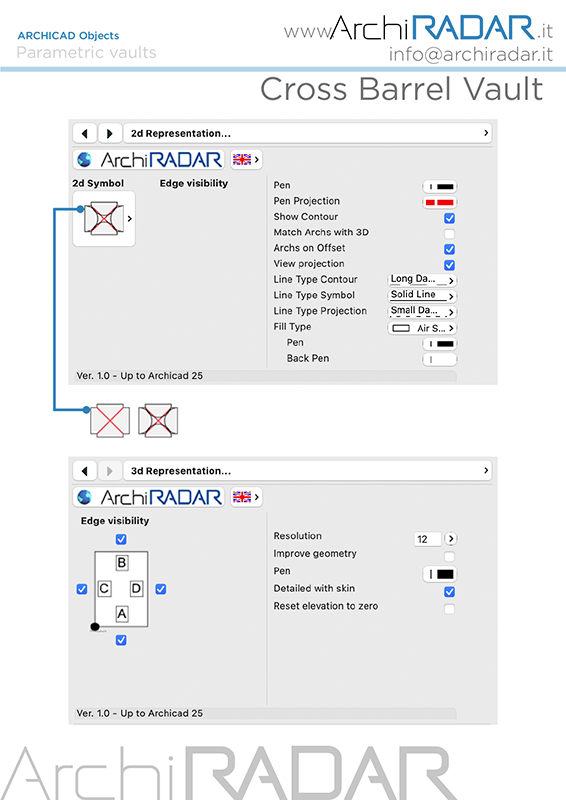 L'oggetto Volta a botte incrociata parametrica di ArchiRADAR è stato concepito per velocizzare il lavoro del progettista, grazie alla possibilità di gestire molti parametri. I quattro punti della volta sono tutti editabili in forme libere anche autonomamente in altezza.