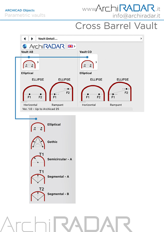 The ArchiRADAR parametric Cross barrel vault have been conceived to speed up the designer's work, thanks to the possibility of managing many parameters.
