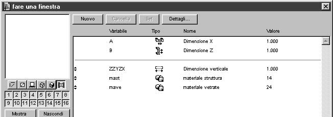 Registrate nuovamente l'oggetto e godetevi qualche vista, ma non vi allontanate ... vi avevo detto che il mio obiettivo era ambizioso ... quello che abbiamo fatto fin qui è stato troppo facile, quindi proviamo ad andare avanti di un ulteriore gradino. Allora andiamo nella finestra principale dell'oggetto e clicchiamo sul pulsante "Parametri", poi su "Nuovo". Nell'area a destra verrà creata una nuova riga, per il parametro appena creato. Nella riga ci sono tre campi editabili e alcuni pulsantini.