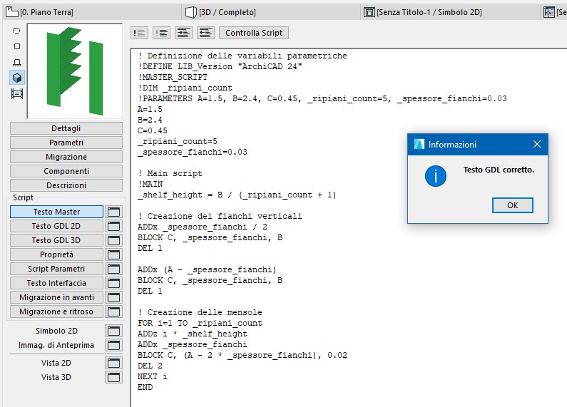 Naturalmente, questo è solo un esempio molto semplice. Per oggetti più complessi, il codice GDL può diventare più elaborato. Potremmo aggiungere ulteriori parametri per controllare altri aspetti dell'oggetto, come il materiale, il colore, la rotazione, ecc.