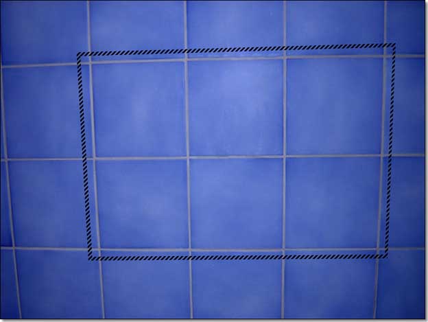 Per ridurre la percezione della ripetizione, non voglio fare una texture composta da una sola piastrella, ma prenderò le sei centrali. Dovrò fare in modo che l'area che occupano, attualmente deformata dalla prospettiva, ritorni ad essere un rettangolo. (Le fotografie risentono anche di un'altra importante deformazione, per cui le linee rette, soprattutto quelle che passano lontano dal centro dell'immagine, hanno un andamento leggermente curvo, e la curva è più accentuata se la focale