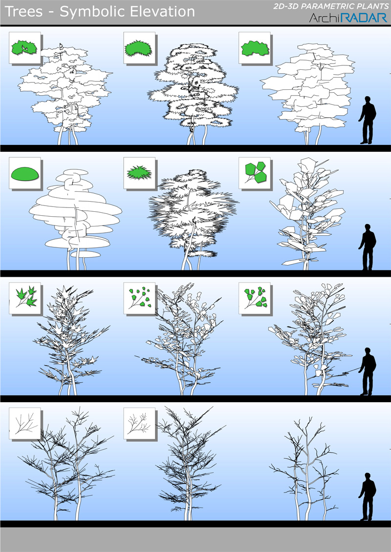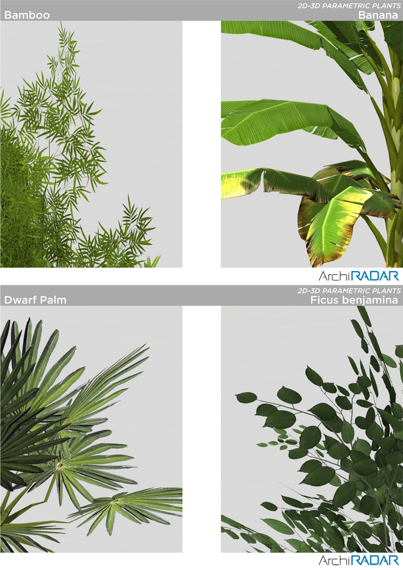 25 Modelli 3D di alberi diversi, compatibili con ArchiCAD 16 o superiore e ottimizzate per CineRender.