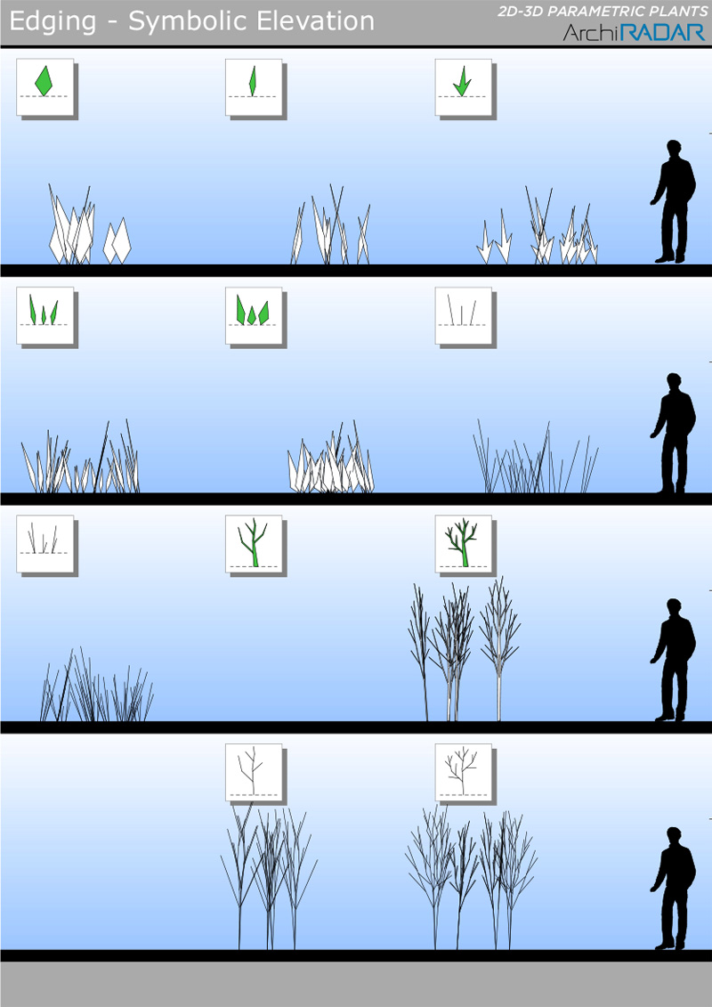 Gli oggetti sono realizzati con un basso numero di poligoni, hanno un fattore di crescita reale in base alla dimensione e inoltre hanno una corrispondente vista simbolica semplificata in prospetto e sezione.