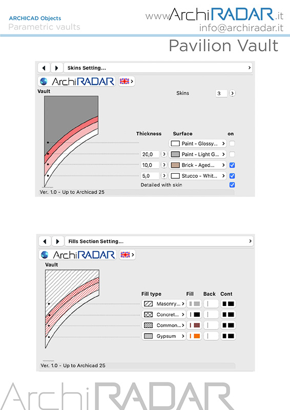 Si possono definire fino a 3 strati indipendenti di spessore nella superficie e nella campitura in sezione. Le lunette sono completamente editabili con dei parametri uniformi o indipendenti. Il simbolo in pianta offre diverse varianti di rappresentazione. La maggior parte dei parametri è gestibile attraverso punti editabili sia nella finestra 3d che 2d. Un’interfaccia grafica dell’oggetto aiuta il progettista nel gestire tutte le funzionalità.